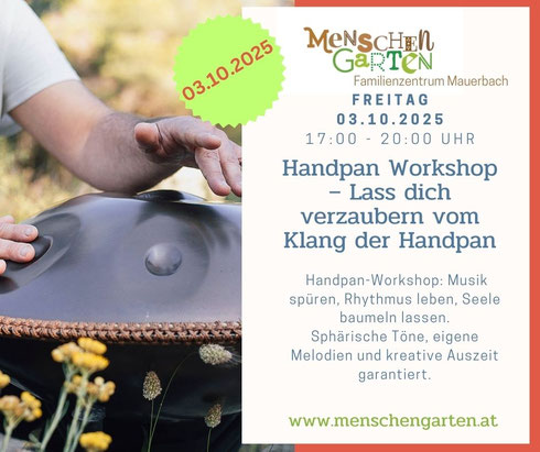 Spüre den Rhythmus, tauche ein in die Magie der Klänge und finde deinen eigenen musikalischen Flow – unser Handpan-Workshop macht es möglich! Dieses außergewöhnliche Instrument verzaubert mit seinen sphärischen Tönen und lädt dazu ein, Klanglandschaften voller Ruhe, Freude und Inspiration zu entdecken.