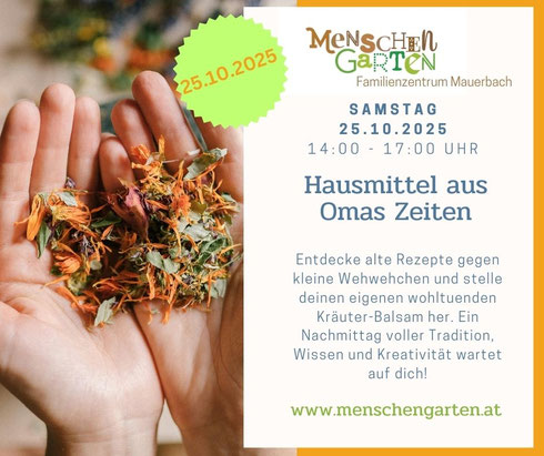 In diesem Workshop entdecken wir gemeinsam alte Rezepte, die auch heute noch nützlich und spannend sind. Außerdem stellen wir einen wohltuenden Kräuter-Balsam her, den du mit nach Hause nehmen kannst. Lass dich inspirieren und erlebe einen Nachmittag voller Tradition, Wissen und Kreativität!