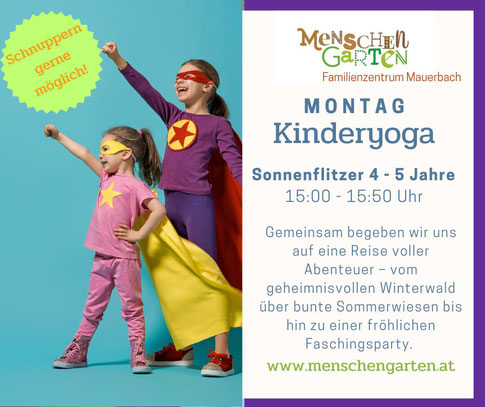 In unserem wöchentlichen Kinderyogakursen laden wir Kinder im Alter von 4 bis 5 Jahre und Kinder im Alter von 6 - 9 Jahre ein, auf spielerische und kreative Weise die Welt des Yoga zu entdecken. Gemeinsam begeben wir uns auf eine Reise voller Abenteuer – vom geheimnisvollen Winterwald über bunte Sommerwiesen bis hin zu einer fröhlichen Faschingsparty oder den Wellen des Ozeans. Jedes Thema bringt spannende Aktivitäten mit sich, die Körper, Geist und Seele in Einklang bringen.