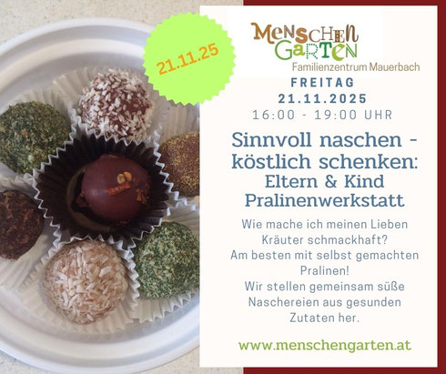 Entdeckt die Freude am Naschen – und das ganz bewusst! In unserer Pralinenwerkstatt zeigen wir euch, wie ihr aus gesunden Zutaten kleine Köstlichkeiten zaubert, die nicht nur lecker sind, sondern auch liebevoll verschenkt werden können.